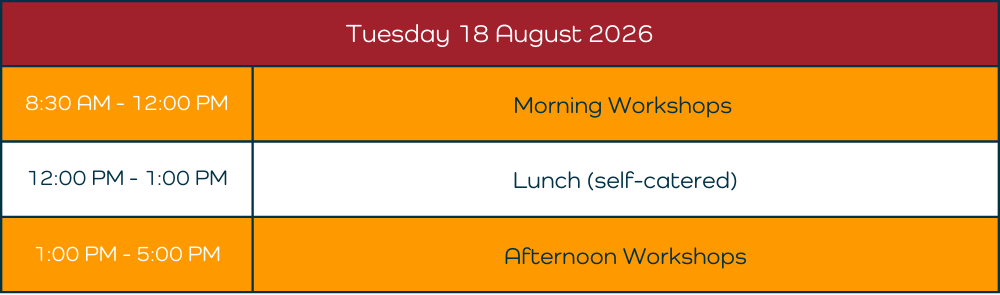 Workshops will be scheduled as either morning or afternoon sessions and will include morning or afternoon tea. Lunch is not provided; however, there are numerous cafés and dining options located nearby.